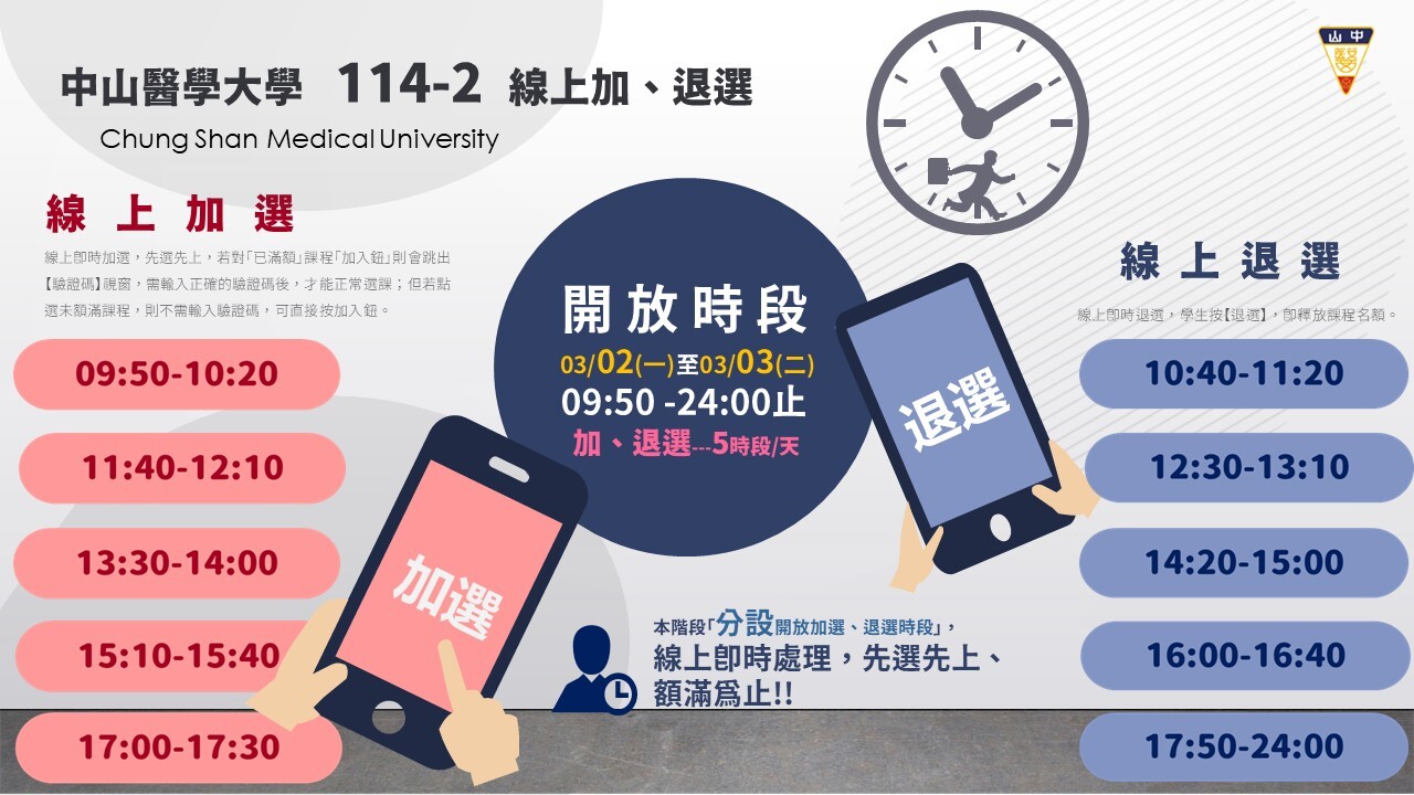 【線上加、退選】開放時間:3月2日(一)至3月3日(二)上午9:50至下午24:00